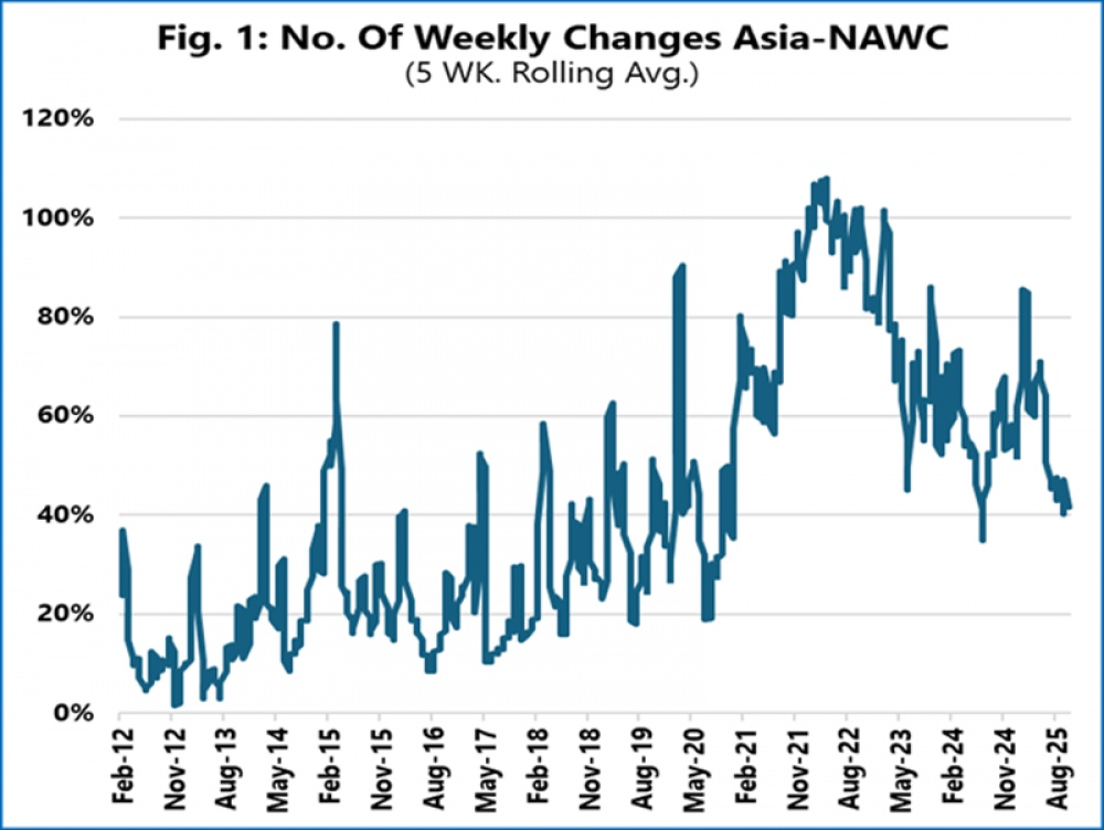 Para cuantificar este tipo de alteraciones, Sea-Intelligence desarrolló una nueva métrica que mide la inestabilidad del servicio, calculando el porcentaje de servicios en una ruta que han experimentado una cancelación o adición no estándar de zarpe. En esa línea, el análisis revela un cambio estructural, con la frecuencia de estas interrupciones semanales en 2024-2025 aumentando entre 2,5 y 3,5 veces en comparación con el período previo a la pandemia.