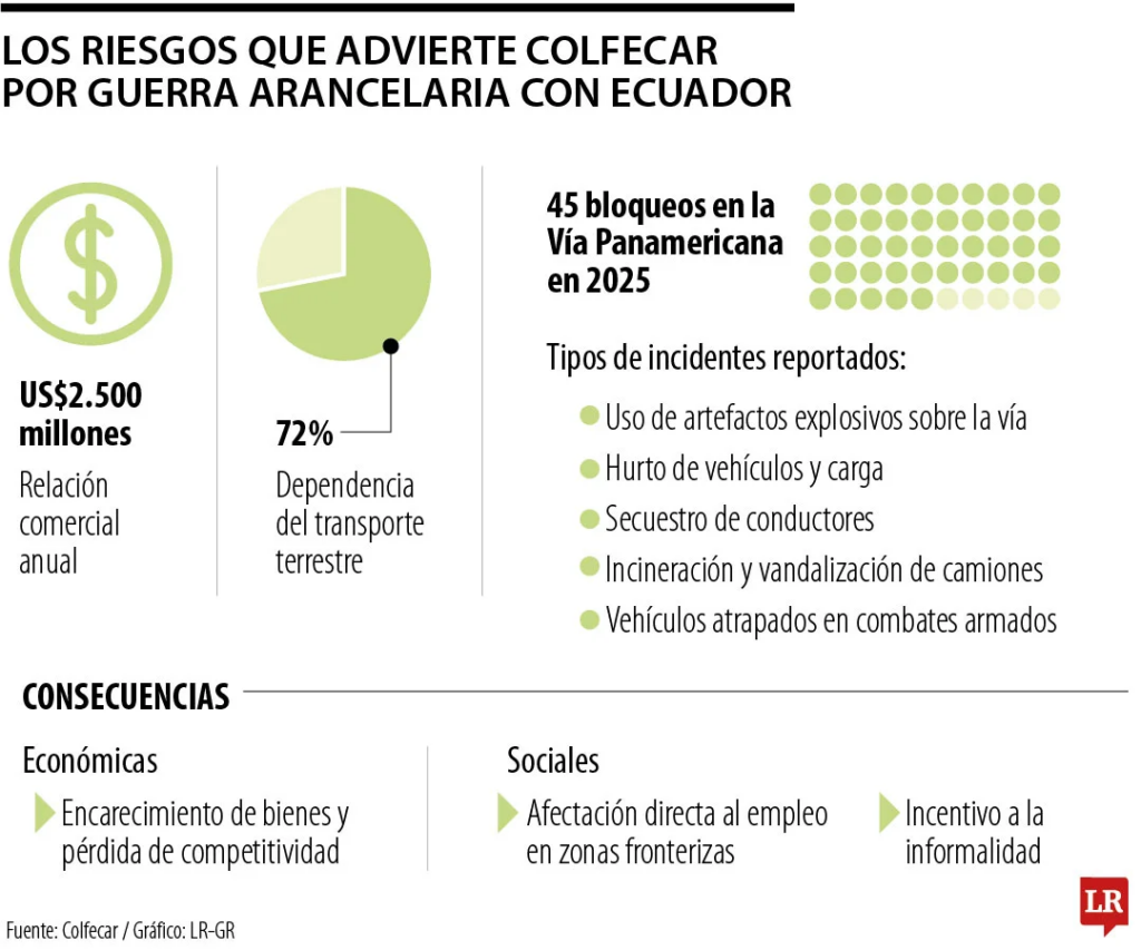 La reciente guerra arancelaria entre Colombia y Ecuador ha generado un ambiente de incertidumbre en diferentes gremios que advierten sobre las consecuencias de un arancel de 30% a las exportaciones provenientes de ambos países. Al llamado de la Andi, CIP y el Consejo Gremial, se sumó el de Colfecar, que advirtió sobre el quiebre de los principios de libre comercio.